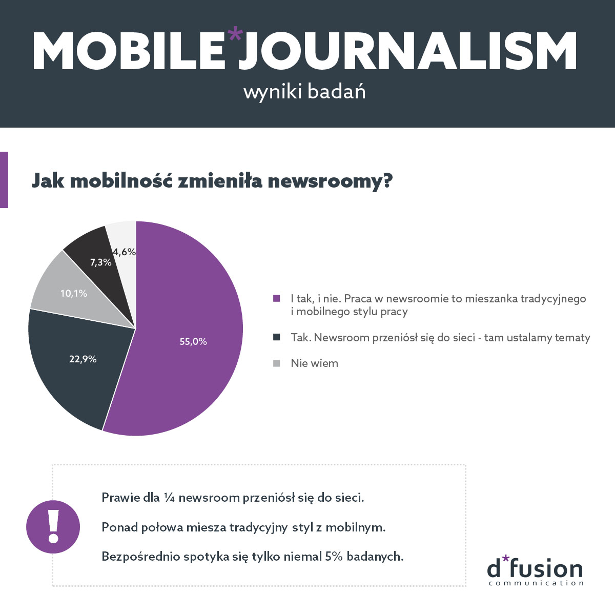 109 ankietowanych dziennikarzy o różnych profilach udzieliło odpowiedzi na 14 pytań, by pokazać, jak smartfony, tablety oraz dostęp do mediów społecznościowych zmienił redakcyjną rzeczywistość.