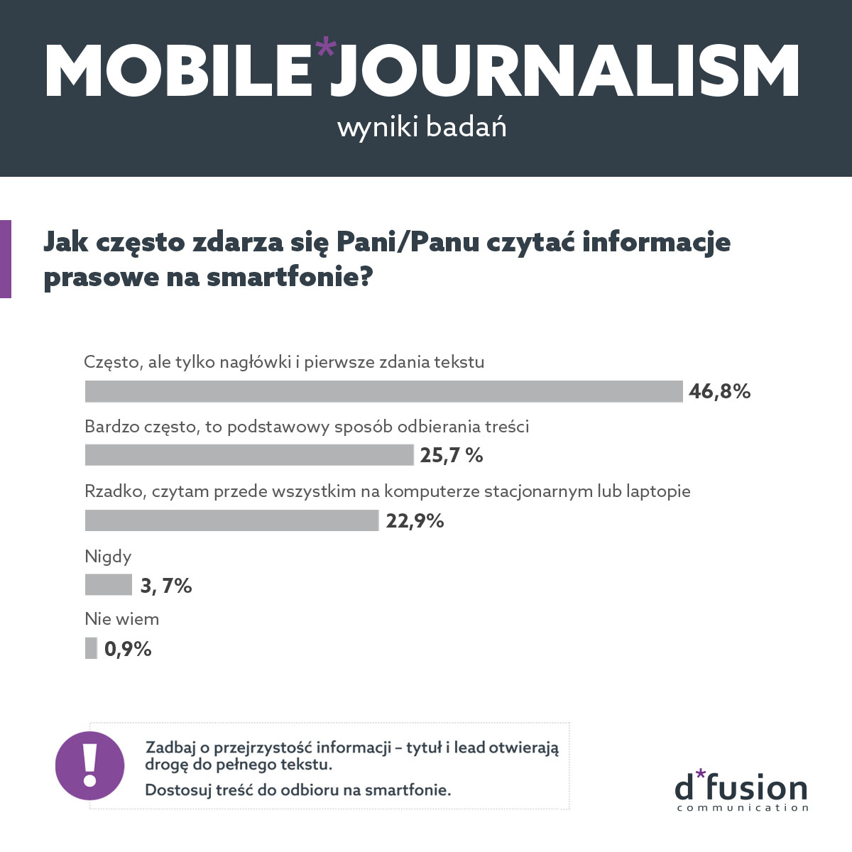 Badanie „Mobile Journalism” pokazuje, że prawie połowa badanych czyta nagłówki i pierwsze zdania tekstu na komórce, a ponad ¼ z nich uznaje to za podstawowy sposób zapoznawania się z nadesłanymi treściami. Zadaniem PR-owca jest zatem dostosowanie informacji prasowej do odczytu na tego typu urządzeniach. I nie chodzi tu o zmienianie długości dostarczanych tekstów, bo jak przyznało ¾ badanych, przyciąga nie rozmiar materiału, ale interesujący temat i treść. Tekst powinien być dostarczony do dziennikarza w takim formacie, aby był łatwy do odczytu na telefonie, np. jako treść maila, który automatycznie dostosowuje się do rozmiaru wyświetlacza.