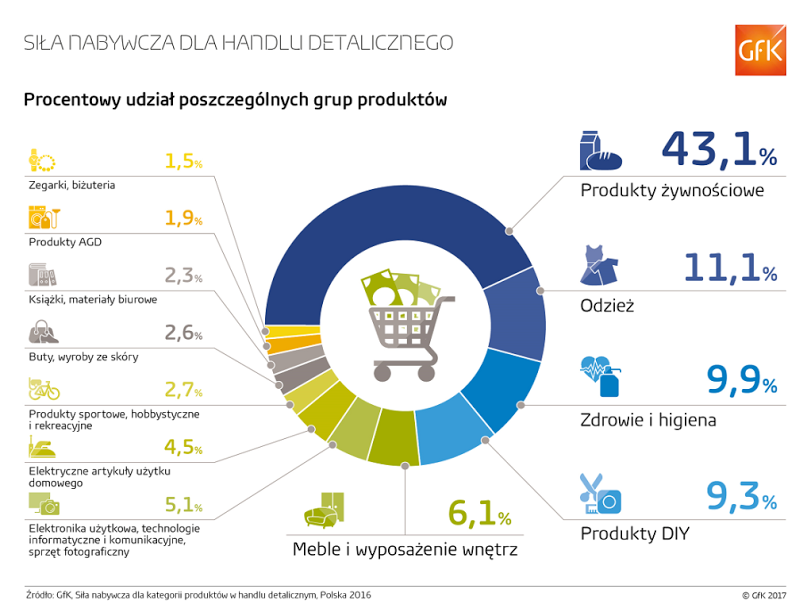 W 2016 roku siła nabywcza dla handlu detalicznego Polaków wyniosła okrągłe 89 mld euro. Blisko 43% z tej sumy Polacy przeznaczyli na artykuły spożywcze.