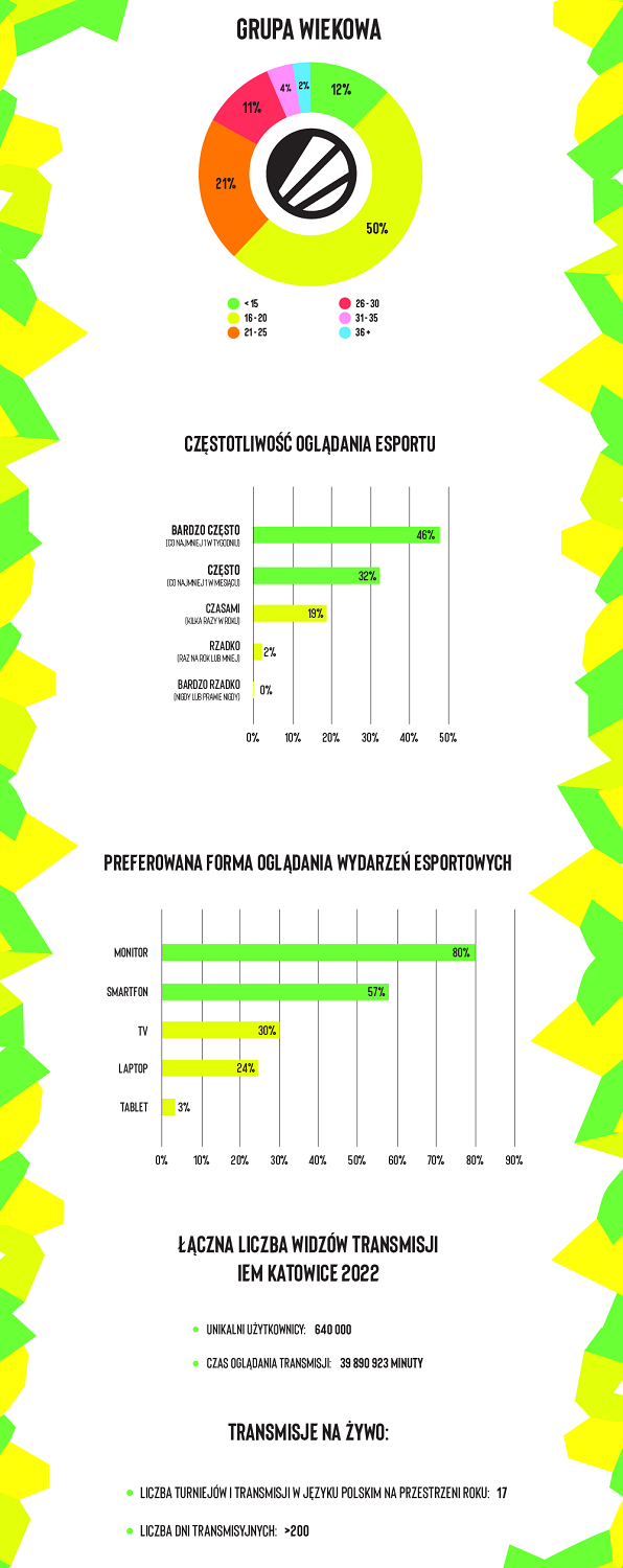 Podczas tegorocznego wydarzenia esportowego Intel Extreme Masters Katowice 2022, ESL przeprowadził ankietę wśród osób oglądających polską transmisję z turnieju. Wyniki wskazują, że młody widz jest w stanie poświęcić znacznie dłuższy czas na konsumpcję treści w sferze, która jest punktem jego pasji i zainteresowania i wiąże się z wartościowymi treściami. Takie właśnie treści widzowie znajdują na transmisji ESL Polska – wyniki badania pokazują, że średni czas oglądania transmisji na indywidualnego użytkownika wynosił 62 minuty. Może się to wydać zaskakujące, biorąc pod uwagę, że aż 83% widowni polskiej transmisji stanowiły osoby poniżej 26 roku życia. 62 minuty to wynik porównywalny z czasem trwania widowisk sportu tradycyjnego i jest on o 22 minuty większy od średniego czasu sesji przeciętnego użytkownika w serwisie Youtube. Należy przy tym wziąć pod uwagę, że 40 minut dotyczy całej platformy YouTube, natomiast 62 minuty to czas spędzony na oglądaniu jednej określonej transmisji w serwisie Twitch.tv.