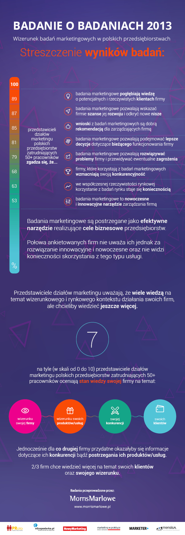 Założeniem projektu „Badanie o badaniach 2013” była analiza opinii polskich marketingowców nt. wykorzystywania badań do realizacji celów biznesowych firmy. Ponad 80% ankietowanych zgodziło się z twierdzeniami, zgodnie z którymi badania marketingowe przyczyniają się do wzrostu wiedzy o klientach i pomagają wskazać firmie szanse rozwoju. Ponadto wyciągnięte z nich wnioski stanowią skuteczną rekomendację dla kadry zarządzającej, a także pozwalają podejmować lepsze decyzje dotyczące bieżącego funkcjonowania organizacji. Mimo tak pozytywnego postrzegania tego narzędzia, połowa respondentów nie uważa jednak badań za rozwiązanie innowacyjne oraz nie widzi konieczności ich zlecania.