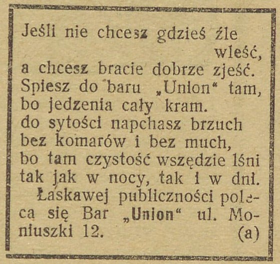 Aby lepiej przyciągać gości, których wówczas nazywano również klientelą, stawiano też na reklamę kreatywną. Pisano rymowanki, wiersze czy też rebusy, z ukrytymi nazwami lokali i dań. Wychodzono również naprzeciw gościowi i zlecano redakcjom prasowym publikacje krótkich jadłospisów na dany dzień. Od siebie dodam jeszcze, że treść ogłoszenia mogła dodatkowo zostać wyróżniona na przykład specjalną ramką czy grafiką.