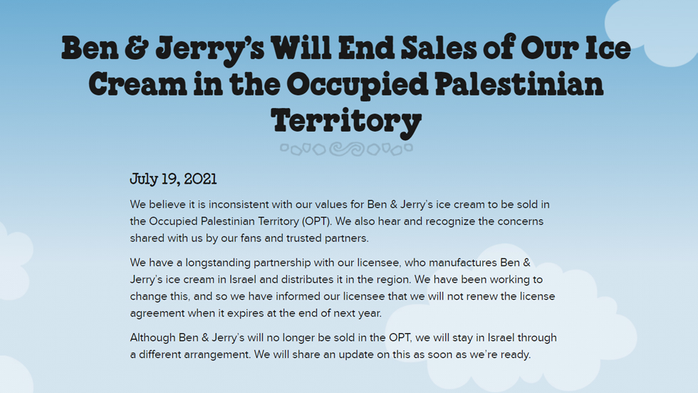 Tak radykalny ruch jest konsekwencją tego, że od jakiegoś czasu marka musiała odpowiadać na zarzuty klientów – ich zdaniem tak liberalna marka nie powinna sprzedawać swoich produktów na terenach okupowanych. Jerry Greenfield i Ben Cohen to niedawna jednak uważali, że mogą dokonać pozytywnych zmian tylko jeśli będą obecni w tym trudnym pod względem politycznym regionie. Ostatecznie jednak zadecydowali wycofać swoje lody Zachodniego Brzego, ale nie z samego Izraela – w tym wypadku firma jest związana umową z innym podmiotem gospodarczym.