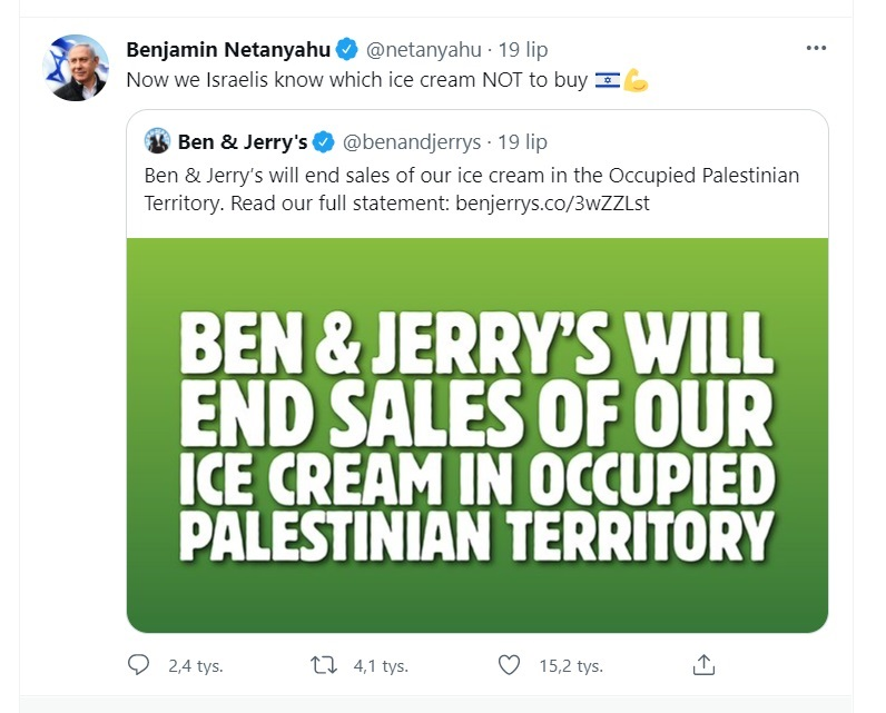 Odważna decyzja firmy została skrytykowana przez władze Izraela. Premier Naftali Bennett i lider opozycji, niedawno odsunięty od władzy Beniamin Netanjahu, rozmawiali na ten temat z samym prezesem firmy Unilever, która jest właścicielem Ben & Jerry’s. Izraelczycy określili akcję marki jako „jednoznacznie antyizraelską”. Co więcej, premiera już zaczął publicznie namawiać Izraelczyków do bojkotowania marki, a także ostrzegł o „poważnych konsekwencjach”. Bennett wezwał też Stany Zjednoczone do wymuszenia zmiany decyzji na spółce.