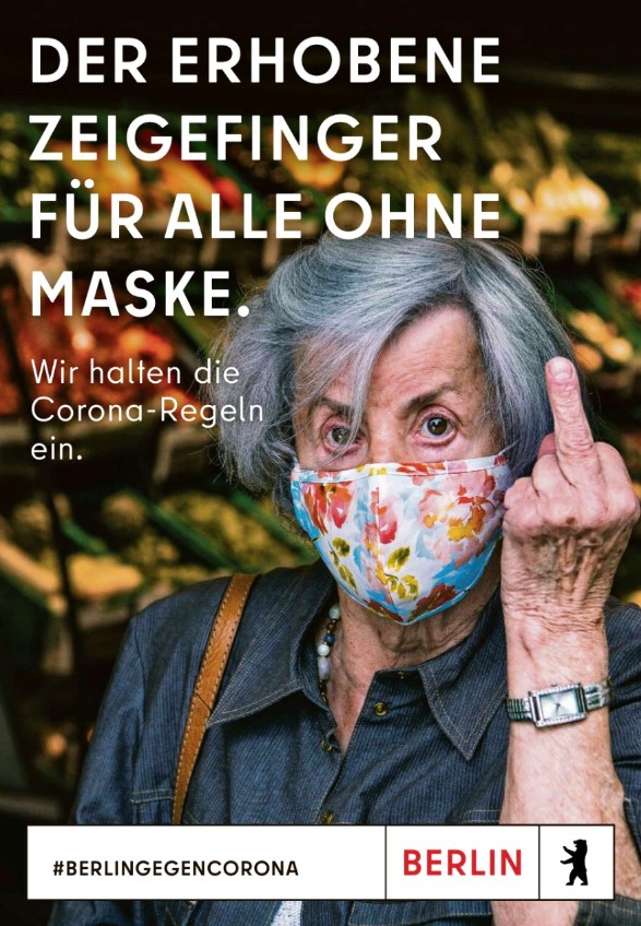 Z tego typu kampanią ruszyły niedawno władze Berlina we współpracy z organizacją Visit Berlin. W jej ramach stworzono plakat przedstawiający starszą kobietę z maseczką na twarzy i pokazującą środkowy palec. Obok niej pojawiło się natomiast hasło – „Środkowy palec do wszystkich osób, które nie noszą maseczek”.