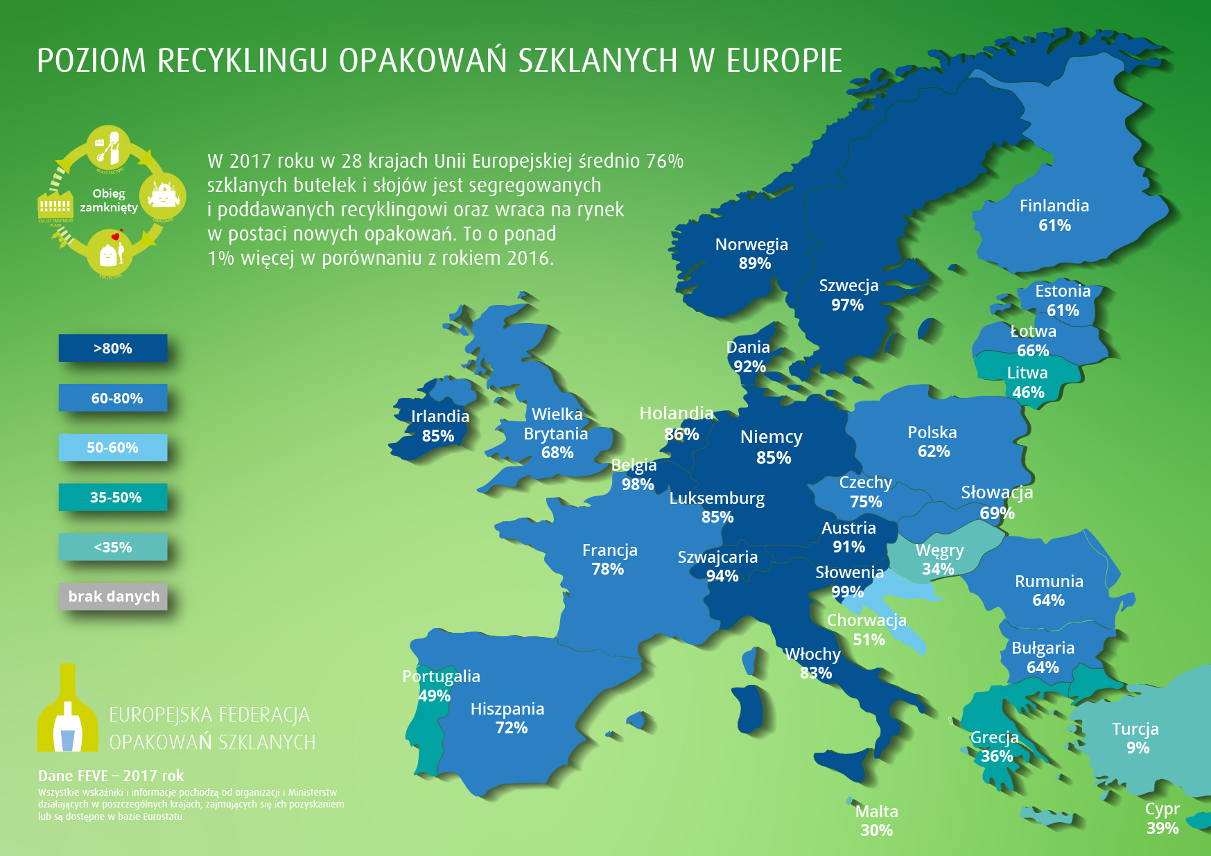 W Polsce wykorzystano i przetworzono 1 187 617 ton szkła (wzrost o 0,80% w porównaniu do 2016 roku), a poddano recyklingowi 742 190 ton. Daje to wzrost rzędu 9,65% w porównaniu do 2016 roku i poziom 62,49% przetworzonych ponownie butelek i słoików.