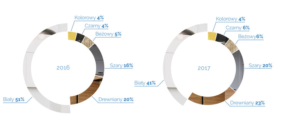 Podobnie jak w zeszłym roku najpopularniejszym kolorem frontów kuchennych jest biały. W roku 2017 interesowało się nim średnio dwóch z pięciu badanych (41%) – to o 10% mniej niż w zeszłym roku. Na drugim pod względem popularności miejscu, pojawiły się fronty imitujące drewno (23%). W tym roku wzrasta zainteresowanie frontami w kolorze szarym (20%).