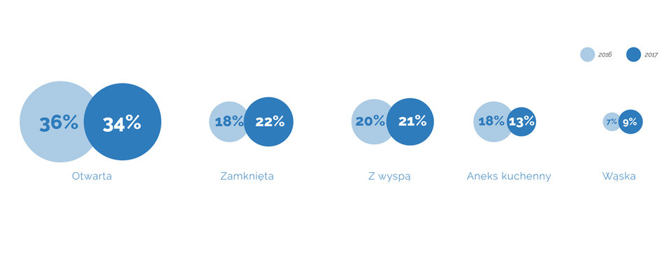 W 2017 roku, podobnie jak w roku ubiegłym, największą popularnością wśród użytkowników Homebook.pl cieszą się kuchnie otwarte na salon (34%). Wzrasta jednak zainteresowanie kuchniami, które stanowią oddzielne pomieszczenie (4% więcej niż w 2016). Co piąty użytkownik portalu Homebook.pl poszukiwał inspiracji kuchni połączonej z wyspą, która ma za zadanie oddzielać strefę kulinarną od wypoczynkowej (21%).
