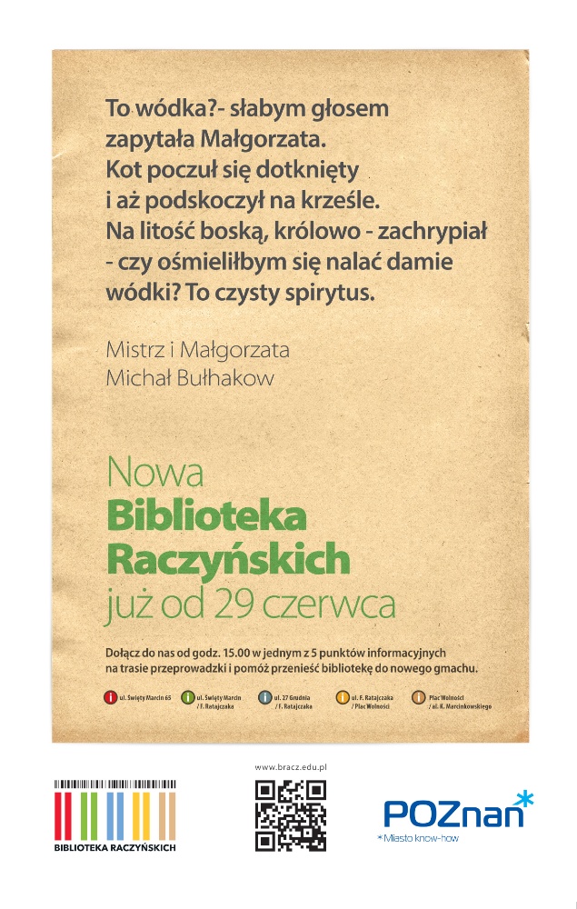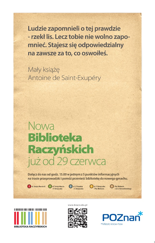 Uroczyste otwarcie nowego gmachu biblioteki, które zaplanowano na 29 czerwca, poprzedzone będzie kampanią promocyjną. Informujące o otwarciu citylighty pojawiły się w różnych częściach miasta 17 czerwca. W kampanii outdoorowej wykorzystano symboliczne cytaty z książek Antoine’a de Saint-Exupéry’ego, Witolda Gombrowicza, Stanisława Lema czy Jerzego Pilcha. Dodatkowo na fasadzie starego gmachu Biblioteki Raczyńskich zamontowana została wielkoformatowa wizualizacja, która oddaje wygląd wnętrza nowego obiektu i pozwala przechodniom już teraz zajrzeć do środka. – Wierzę, że nasze działania zainspirują mieszkańców do rozpoczęcia nowej przygody z książkami i przypomnienia sobie znanych lektur. Jednocześnie chcemy w niestandardowy sposób uświadomić wszystkim, jak inny może być obiekt, do którego przyzwyczaili się latami. Teraz, budynek który wielu przerażał swoją niedostępnością i wyniosłością to wnętrze dostępne dla każdego – tłumaczy Joanna Nowaczyk, Zastępca Dyrektora Biura Promocji Miasta.