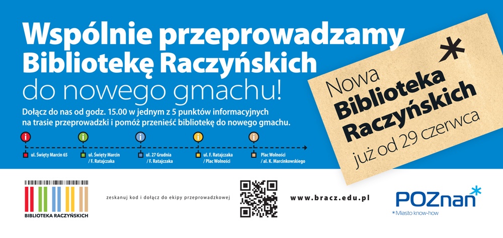 Dlatego 29 czerwca, w dniu otwarcia Nowego Skrzydła Biblioteki Raczyńskich, w Poznaniu odbędzie się również szereg wydarzeń towarzyszących, mających na celu propagowanie czytelnictwa wśród mieszkańców stolicy Wielkopolski. Poznaniacy będą mogli m.in. pomóc w „przeprowadzeniu biblioteki” z ul. Św. Marcin do Nowego Skrzydła Biblioteki. Ochotnicy utworzą łańcuch ludzi, którzy z rąk do rąk będą przekazywać sobie pakiety książek. Wszyscy, którzy chcą wziąć udział w akcji o godzinie 15.00 powinni przyjść do jednego z punktów informacyjnych na trasie przeprowadzki, by otrzymać niezbędne wskazówki i pamiątkową koszulkę. Tego samego dnia, w 5 miejscach w centrum Poznania, powstaną również czytelnie na świeżym powietrzu, w których będzie można skorzystać z udostępnionych pozycji książkowych. Dużą atrakcją dla miłośników książek będzie też wystawa „Księgi i sztuka”. Pilnie strzeżony i na co dzień niedostępny czytelnikom biblioteczny skarbiec, otworzy swoje podwoje dla zwiedzających. Natomiast od 15 do 28 czerwca zainteresowane osoby mają możliwość internetowej licytacji mebli, które do tej pory służyły pracownikom i czytelnikom gmachu Biblioteki przy ul. Św. Marcin. Aukcja dostępna jest pod adresem: www.poznan.allegro.pl. Miłośnicy fotografii i czytania mogą natomiast wziąć udział w konkursie „Zaczytany Poznań”. Na autorów najlepszych zdjęć, czekają atrakcyjne nagrody. Miasto Poznań przygotowało też niespodziankę dla użytkowników serwisu Foursquare. Każdy, kto w dniach 29 czerwca – 1 sierpnia zamelduje się za pomocą aplikacji w Bibliotece Raczyńskich otrzyma pamiątkową zakładkę do książki.