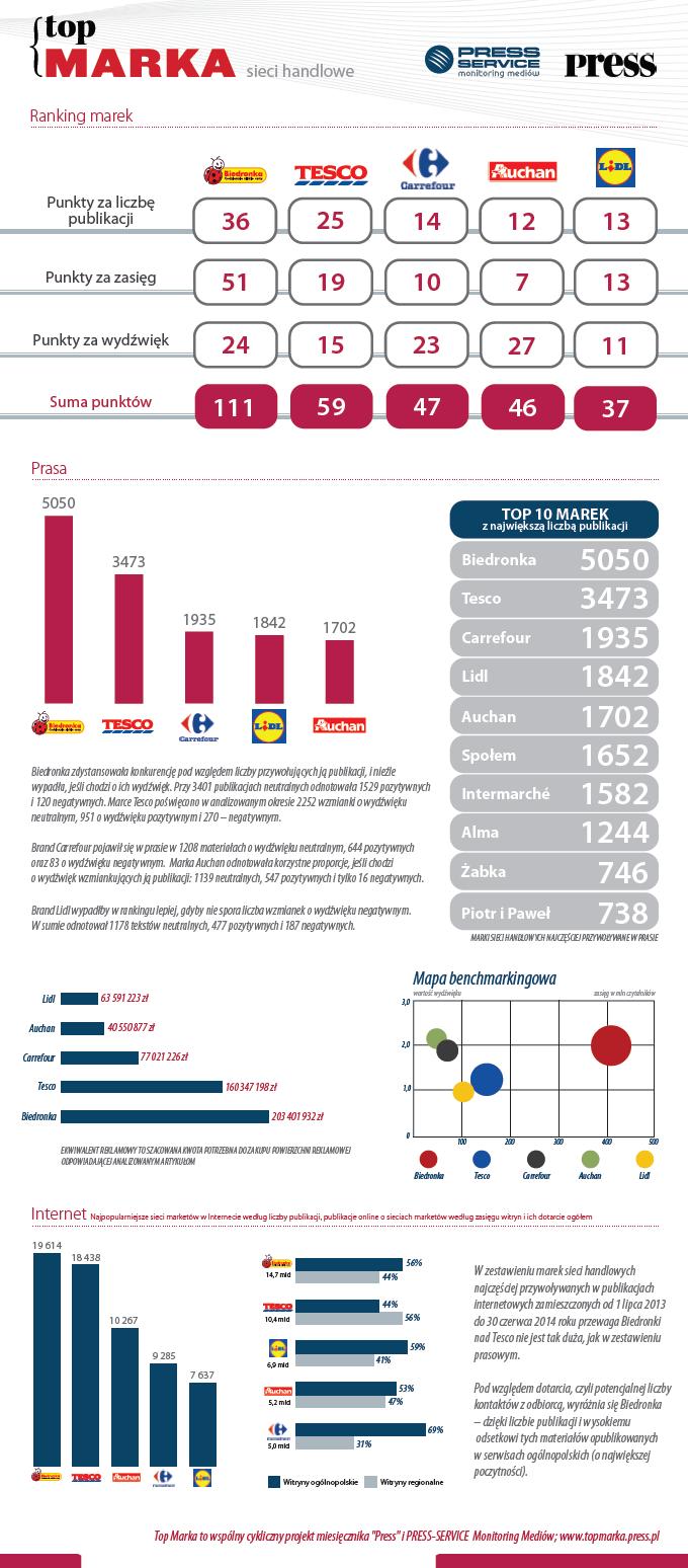 Lider branży zdystansował konkurencję zarówno w prasie, jak i w internecie. Od lipca 2013 do czerwca 2014 na temat Biedronki pojawiło się 5050 publikacji prasowych. Przewaga w ilości informacji nad zajmującym drugą pozycję Tesco wyniosła 1577. Ponad 30 proc. materiałów miało pozytywny wydźwięk dla brandu. Analitycy oszacowali ekwiwalent reklamowy publikacji na temat dyskontu na ponad 203 mln zł. Warto dodać, że łączna liczba 111 punktów uzyskanych przez Biedronkę w analizie ilościowej i jakościowej przekazu w prasie okazała się jednocześnie trzecim wynikiem w całym badaniu. Wyższą ocenę uzyskały Orlen (124) oraz PZU (113).