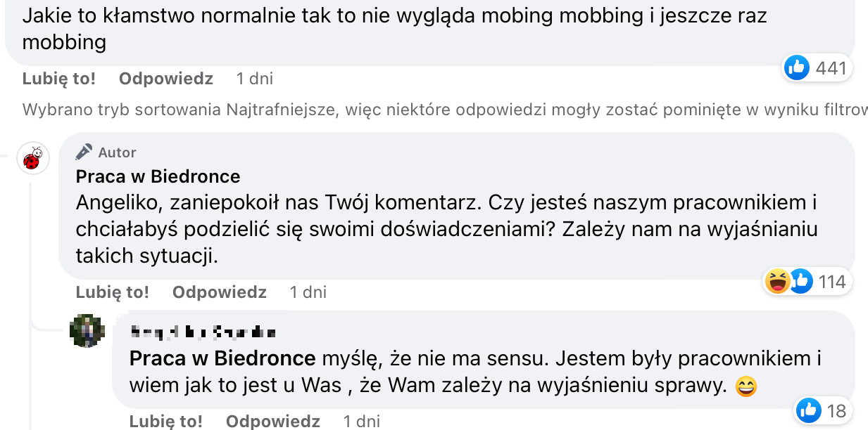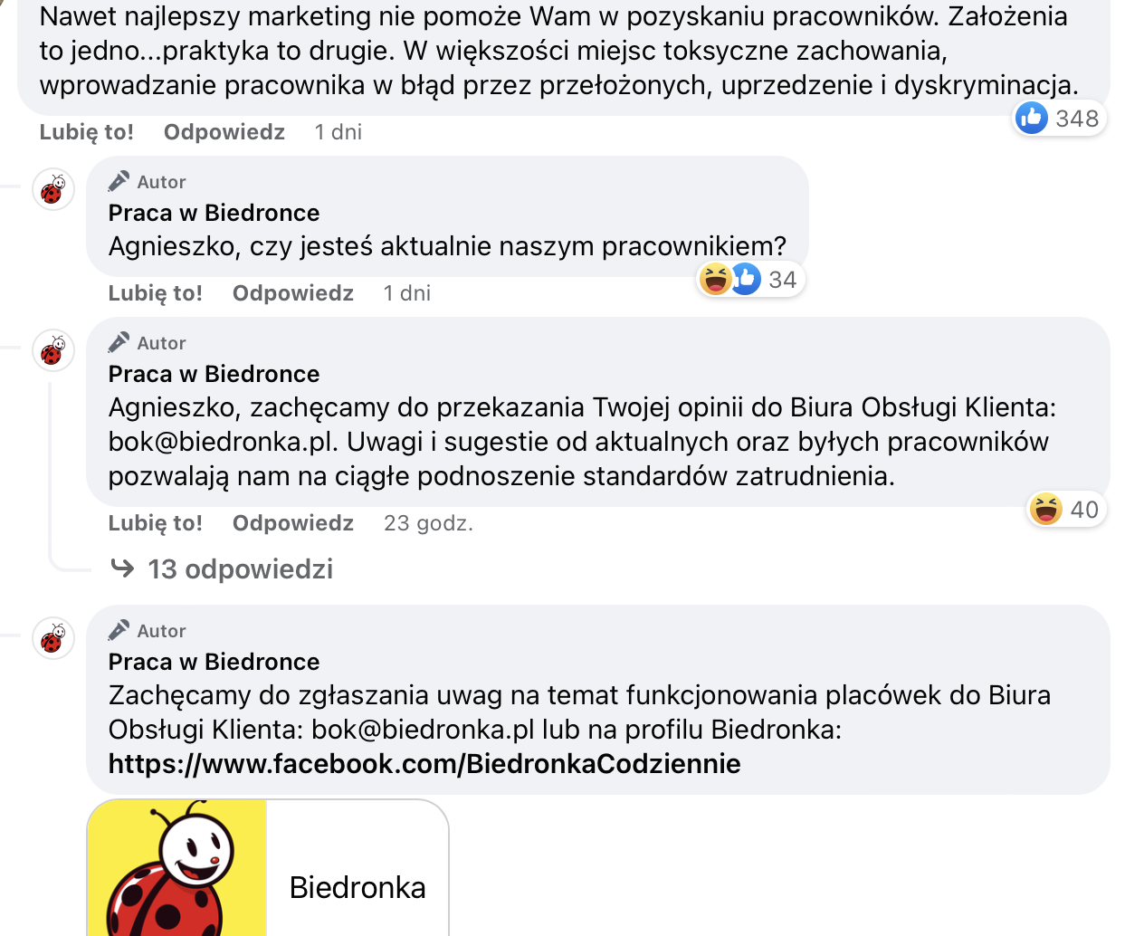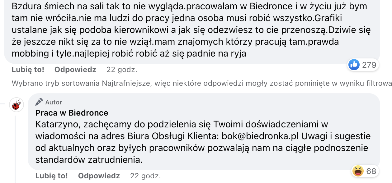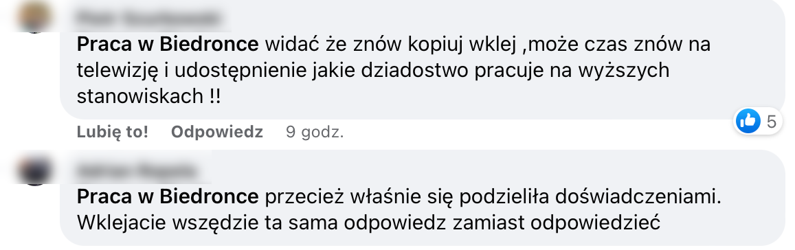 Co ciekawe, Biedronka nie usuwa niepochlebnych komentarzy pod postem i stara się na większość z nich odpowiadać. Problem jednak w tym, że odpowiedzi na konkretne zarzuty względem sklepu są takie same – są kopiowane i wklejane pod większością komentarzy.