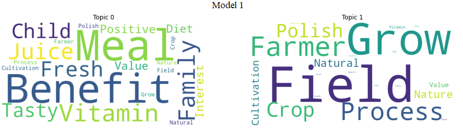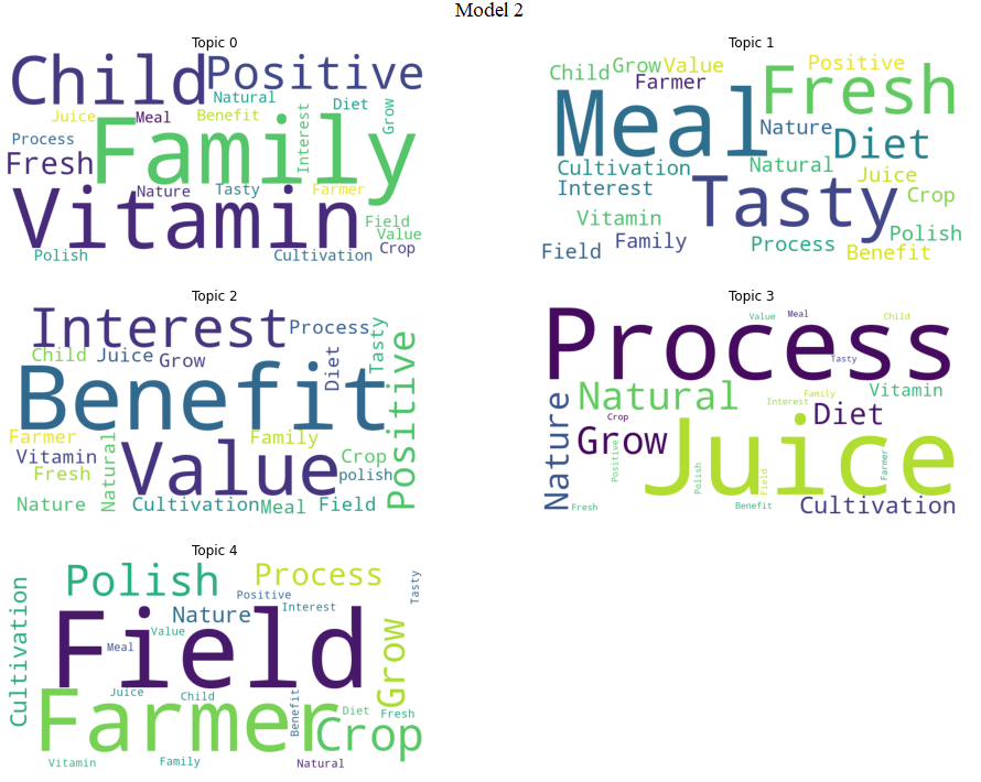 Words: 0.136*”meal” + 0.119*”benefit” + 0.100*”vitamin” + 0.091*”family” + 0.086*”juice” + 0.082*”fresh” + 0.074*”child” + 0.072*”tasty” + 0.064*”positive” + 0.059*”value” + 0.058*”diet” + 0.057*”interest”Topic: 1