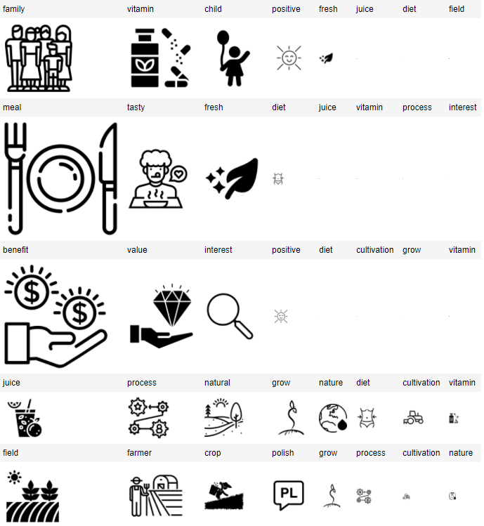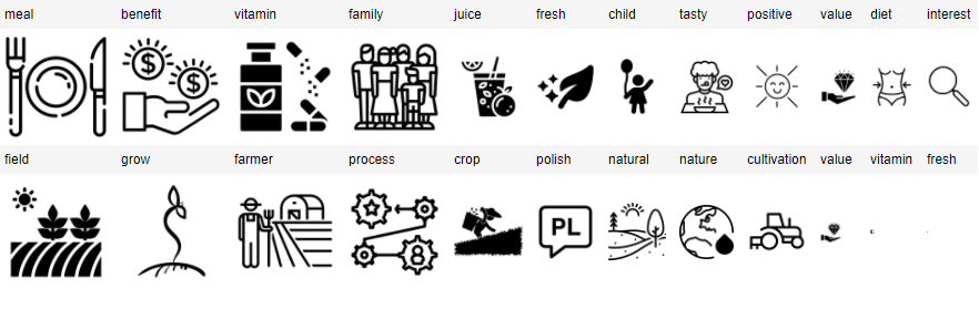 - Treści korzystne dla innych (topic: 1), czyli cechy produktu, które sprawiają, że konsument z większą ufnością i spokojem podejdzie do zakupu. W przypadku marchwi jest to przywiązanie do naturalnego pochodzenia produktu i troski o niego przez rolnika/producenta. Wskazują to słowa: pole, rosnąć, rolnik, proces, plon, polskie, naturalne.