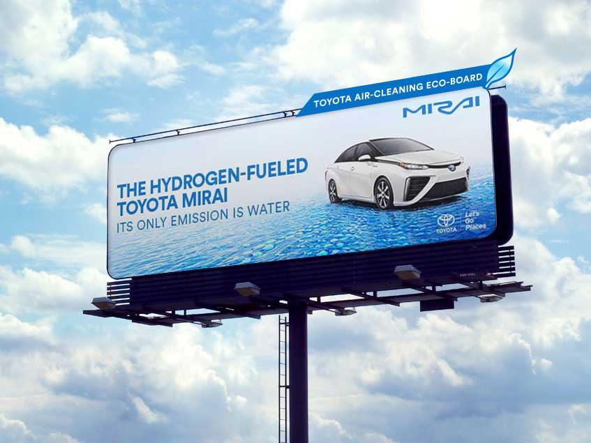 Japończycy jako pierwsi na rynek wprowadzili auto napędzane wodorem -Toyote Mirai. Marka do promocji nowego samochodu wykorzystała outdoor. W Kalifornii rozstawiono specjalne billboardy, które zawierają tlenek tytanu. Ten w połączeniu z powietrzem staje się katalizatorem i usuwa z niego szkodliwe tlenki azotu.