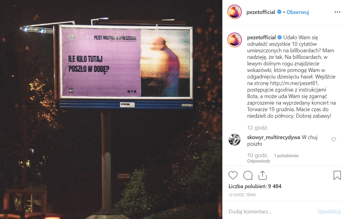 – Udało Wam się odnaleźć wszystkie 10 cytatów umieszczonych na billboardach? Mam nadzieję, że tak. Na billboardach, w lewym dolnym rogu znajdziecie wskazówki, które pomogą Wam w odgadnięciu dziesięciu haseł. Wejdźcie na stronę, postępujcie zgodnie z instrukcjami Bota, a może uda Wam się zgarnąć zaproszenie na wyprzedany koncert na Torwarze 19 grudnia. Macie czas do niedzieli do północy. Dobrej zabawy! – poinformował Pezet.