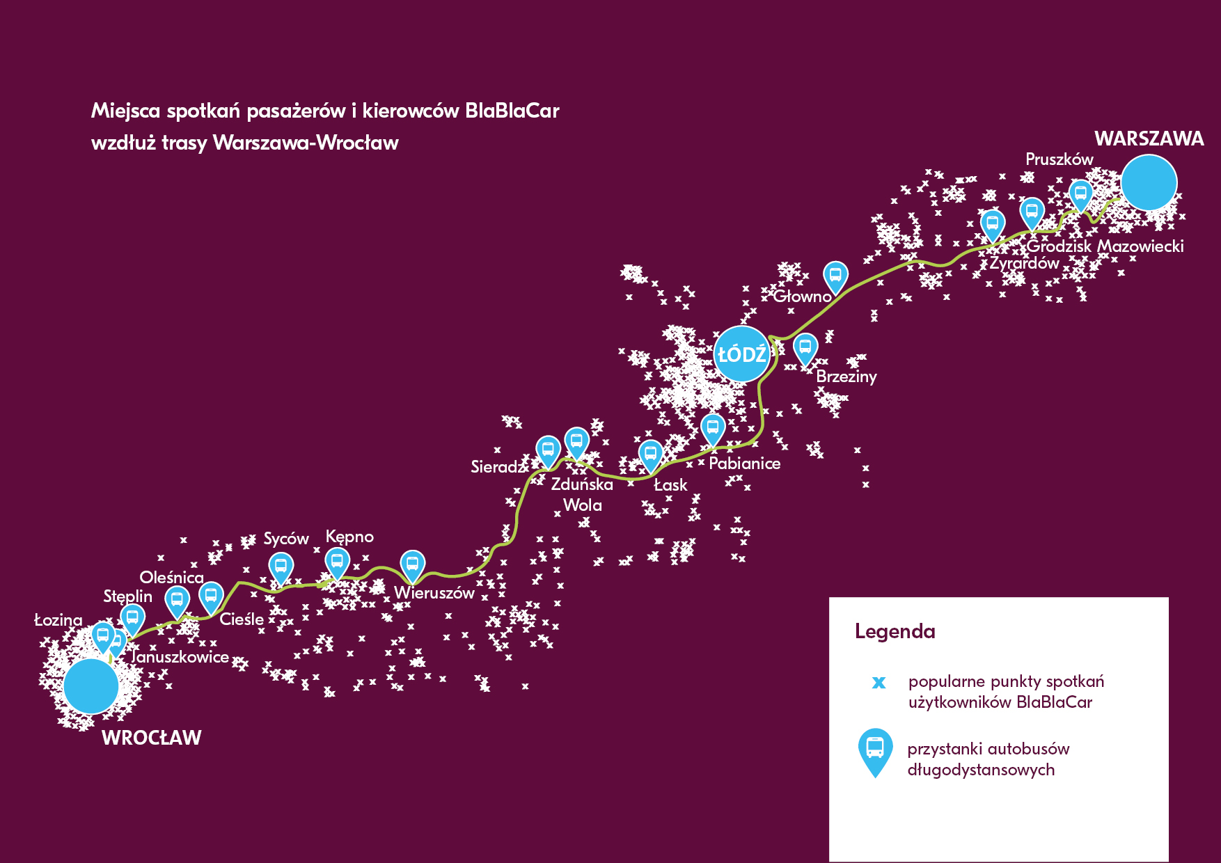 Miejsca spotkań pasażerów i kierowców BlaBlaCar wzdłuż trasy Warszawa-Wrocław.
