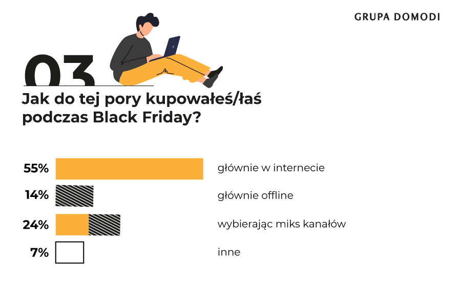 Pomimo sytuacji związanej z pandemią, aż 73% badanych deklaruje, że w tym roku ich nawyki zakupowe związane z Black Friday nie ulegną zmianie, z czego: 45% skupi się głównie na sklepach online, 5% zrealizuje swoje potrzeby w sklepach stacjonarnych, 16% – postawi na miks kanałów, a 7% deklaruje całkowitą rezygnację z zakupów w tym czasie. Wśród najmniej skorych do zmian zachowań znalazły się osoby w wieku 25-34 lata.