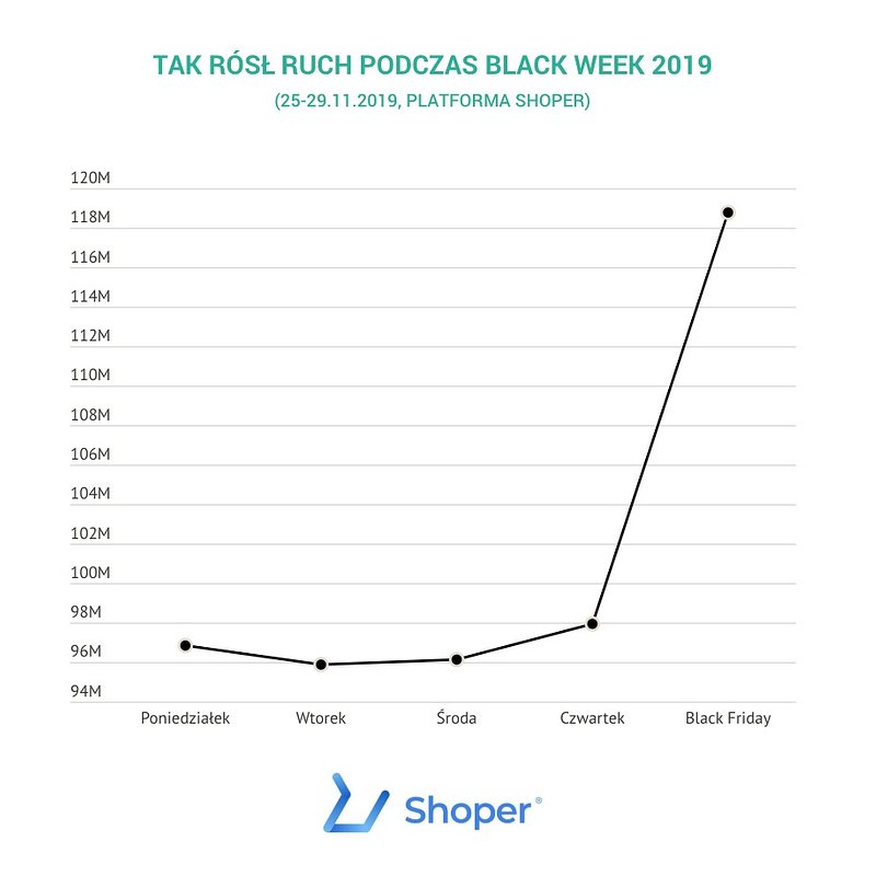 Statystyki Shopera z minionych lat pokazują, że w grudniu wyniki nigdy nie były aż tak dobre jak w Black Friday, jednak o mniej więcej 1/3 wyższe niż przed okresem świątecznym. Taki stan utrzymywał się do ok. 20 grudnia, po czym następował świąteczno-noworoczny spadek. Prawdopodobnie tak samo będzie wyglądać też sytuacja w tym roku. Więc Black Friday śmiało można nazwać otwarciem sezonu świątecznego w e-sklepach.