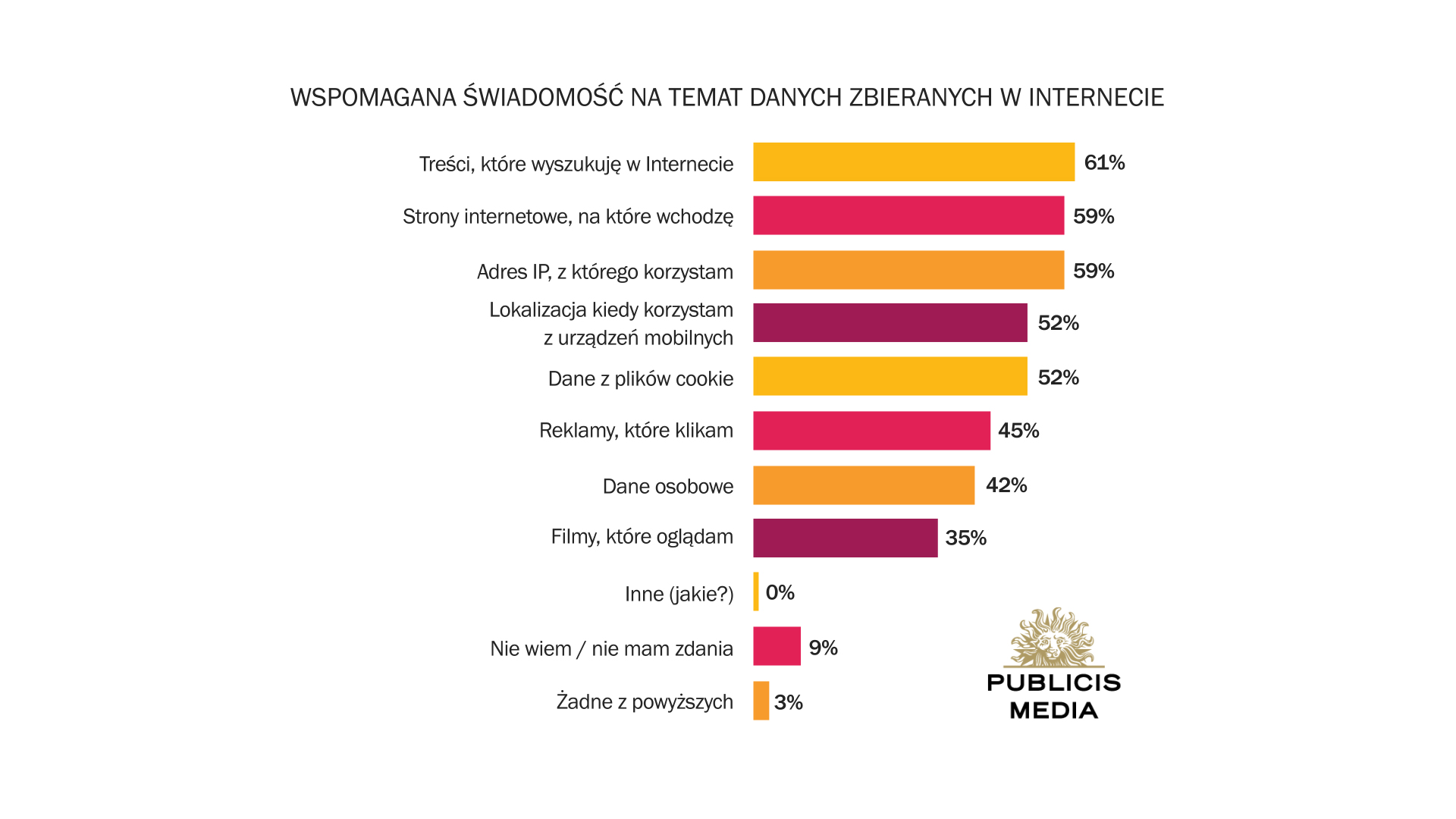 Respondenci w badaniu odpowiadali także na pytanie, jakie informacje na temat ich aktywności w sieci są zbierane. W odpowiedziach najczęściej wymieniane były: „treści, których szukam w internecie” – 61 proc. wskazań, „strony internetowe, na które wchodzę” – 59 proc. wskazań, „adres IP, z którego korzystam” – 59 proc. oraz „lokalizacja, kiedy korzystam z urządzeń mobilnych” – 52 proc.