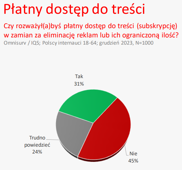 Ostatnie badanie IAB Polska pokazuje, że odsetek dorosłych internautów stosujących adblocki w 2023 roku wyniósł 45 proc., co jest tylko nieznacznym wzrostem w stosunku do 42 proc. odnotowanych w 2017 roku. Najnowsze wyniki udowadniają, że tempo rozwojowe zjawiska zdecydowanie wyhamowało i ustabilizowało się, a w najbliższych latach możemy spodziewać się utrzymania tego trendu.