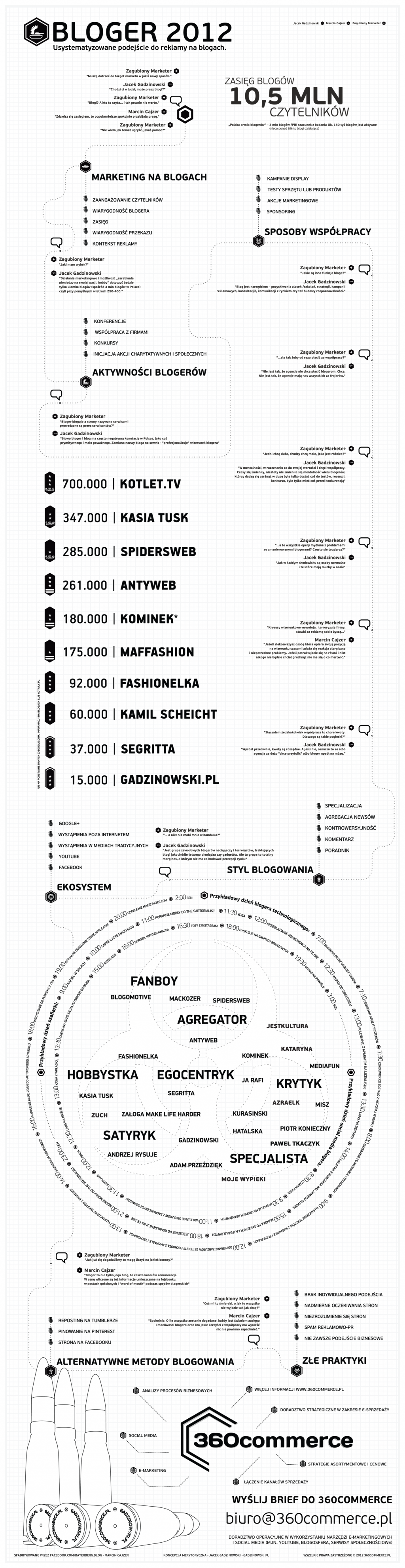 Jacek Gadzinowski z 360commerce przedstawił  subiektywne spojrzenie na blogosferę, blogi i reklamę na blogach w 2012 roku. Konkretnie, ale też z przymrużeniem oka przyjrzał się polskiej blogsferze. Oprócz informacji o zasięgu blogów, można poznać alternatywne sposoby blogowania, jego style oraz złe praktyki.