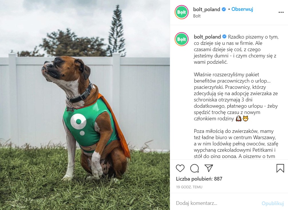 Bolt rusza z akcją, która ma na celu zachęcenie pracowników firmy do adopcji zwierzaków ze schroniska. Z tej okazji, marka wprowadza 3-dniowy urlop psacierzyński.