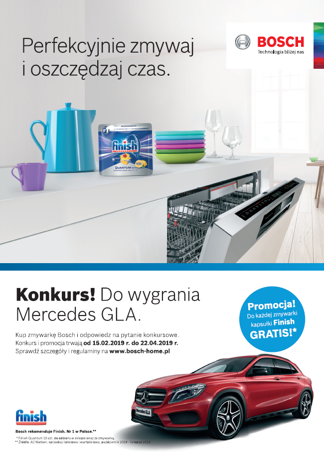 Bosch we współpracy z marką Finish zachęca do odbycia „konkursowej” podróży, którą moglibyśmy zrealizować w czasie zaoszczędzonym dzięki zmywarce. Zwycięzca konkursu będzie mógł odjechać w nią nowym mercedesem GLA. Konkurs trwa od 15 lutego do 22 kwietnia 2019 roku. Skierowany jest do wszystkich, którzy w czasie akcji kupią zmywarkę marki Bosch. By wygrać wymarzony samochód wystarczy odwiedzić stronę producenta, zarejestrować zakup za pośrednictwem formularza i przesłać odpowiedź na pytanie konkursowe: W jaką podróż wybrałbyś się w zaoszczędzonym dzięki zmywarce czasie?