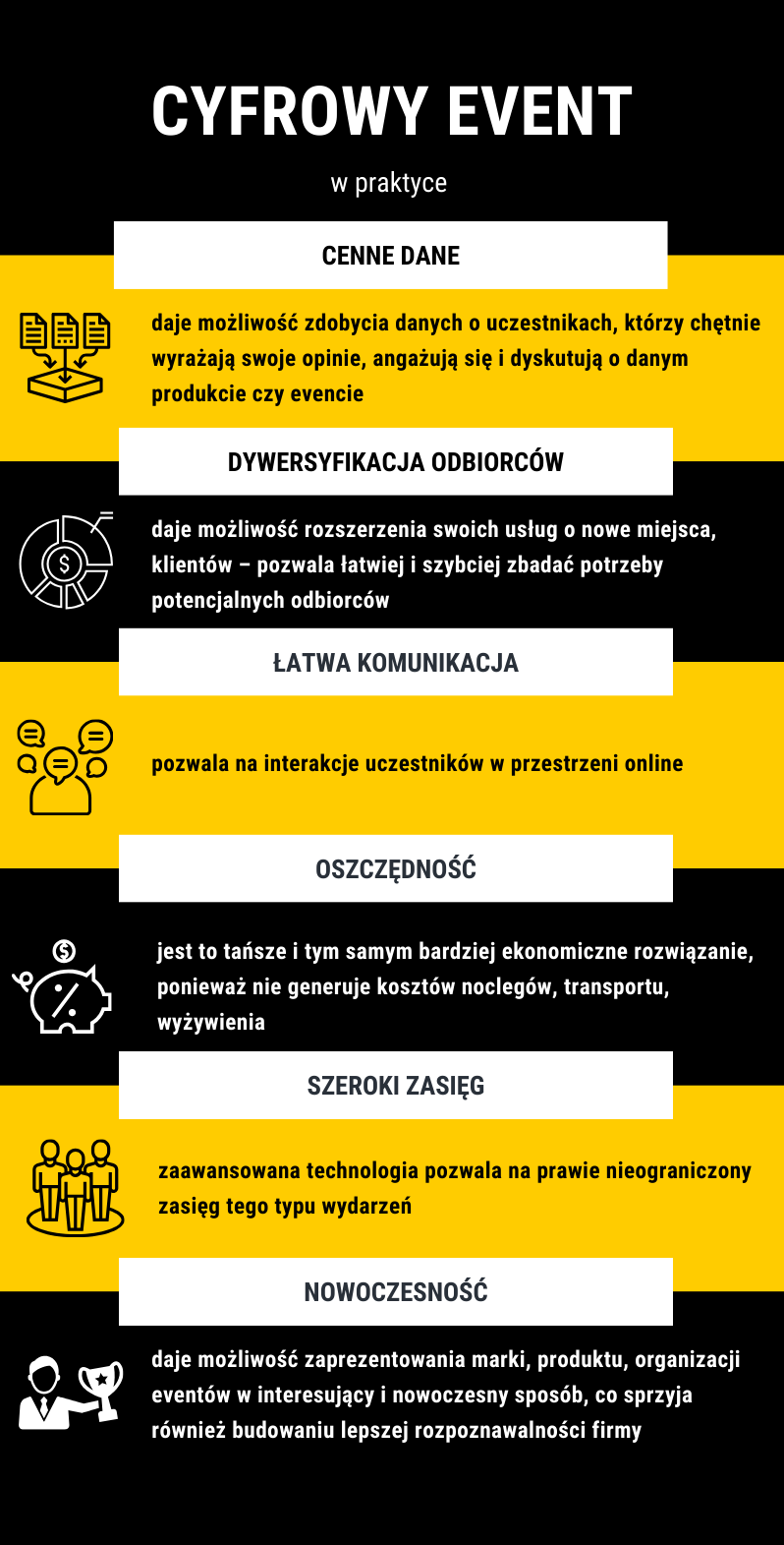 Wiele firm w odpowiedzi na trudną sytuację wzbogaciło swoje oferty o wirtualną działalność. Środowisko online można zaprojektować na wiele sposobów. Webinaria wykorzystywane są głównie jako narzędzia marketingowe czy szkoleniowe. Podczas takiej sesji możliwa jest m.in. transmisja wideo, pokaz slajdów, udostępnianie plików czy dzielenie pulpitu. Bardziej złożone aplikacje do organizacji spotkań online umożliwiają również interakcję z uczestnikami, poprzez wprowadzanie elementów interaktywnych: testów, ankiet, quizów, czatów (np. Targi Pracy Career EXPO i pokoje rozmów, w których można było komunikować się bezpośrednio z pracodawcą za pomocą czatu).