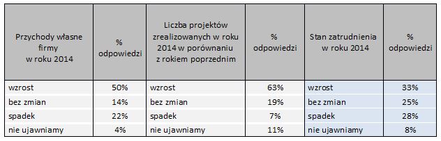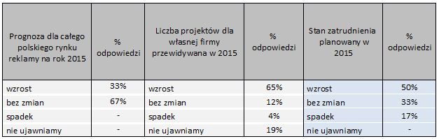 Dwie trzecie spośród badanych firm zakończyło 2014 rok nieznacznie zwiększając przychody lub utrzymując je na poziomie z 2013 roku. Ilość zleceń na rynku rosła szybciej. Ponad 80% firm deklaruje tu wzrost lub utrzymanie pozycji. Dlatego wzrostowi nie zawsze towarzyszył wzrost zatrudnienia czy pensji. Można wyciągnąć wniosek, że reklamodawcy oczekują więcej za te same pieniądze. Mimo przyrostu zleceń, agencje nie mogą sobie jeszcze pozwolić na inwestycje w kadry i muszą radzić sobie z zasobami, które posiadają. Firmy sektora komunikacji zmuszone są do dalszego poszukiwania źródeł zwiększania efektywności bez powiększania struktur własnych, co w branży polegającej wyłącznie na talencie ludzi jest trudne.