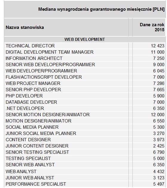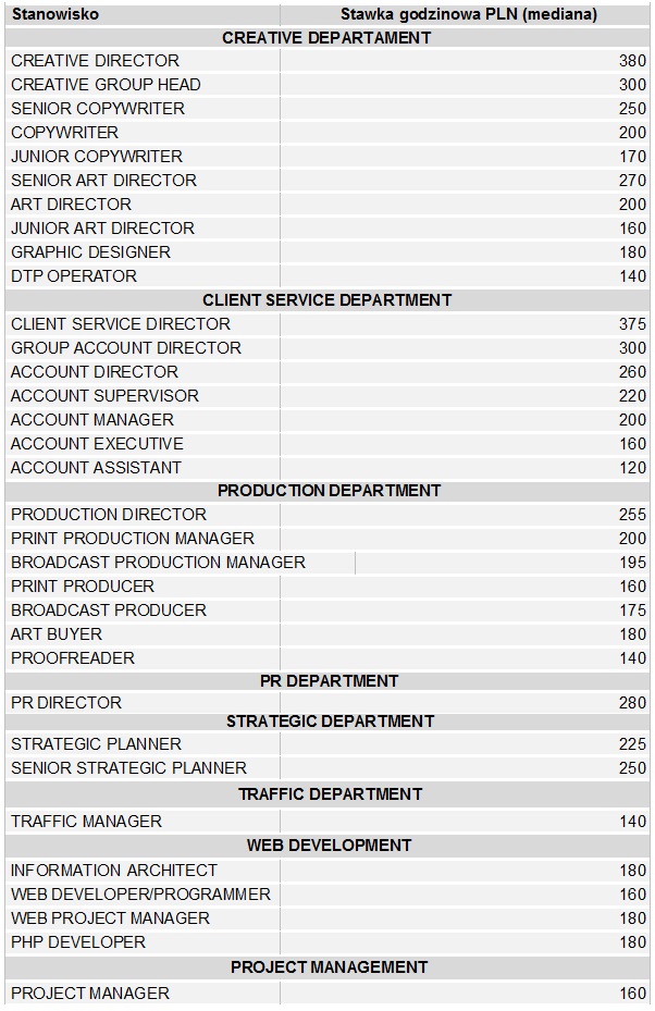 W bieżącym roku stawki godzinowe uległy lekkiej obniżce (-2%), co jest kolejnym dowodem panującej stagnacji w branży reklamowej. Porównując wartości mediany stawek rynkowych r/r można stwierdzić, iż dla 13 stanowisk, aktualne stawki godzinowe wzrosły w porównaniu z rokiem 2014 lub pozostały bez zmian, a spadły dla 20 stanowisk.