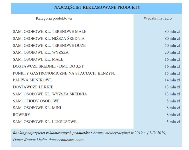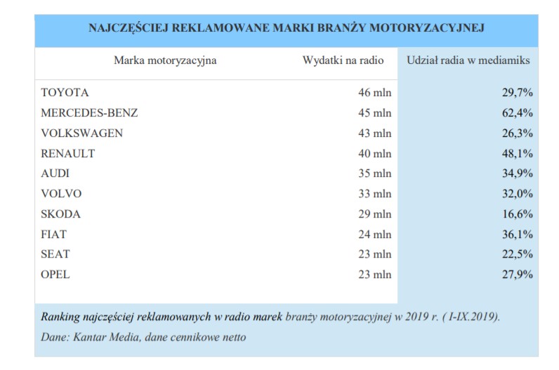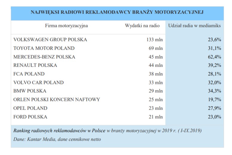 Niektórzy z największych marketerów, w badanym okresie, wydali na reklamę radiową ponad połowę całego budżetu reklamowego np. Mercedens Benz – Polska czy BP Europa SE. W czołówce największych radiowych reklamodawców w mijającym roku w branży motoryzacyjnej znalazły się Volkswagen Group Polska, Toyota Motor Poland oraz Mercedes-Benz Polska.