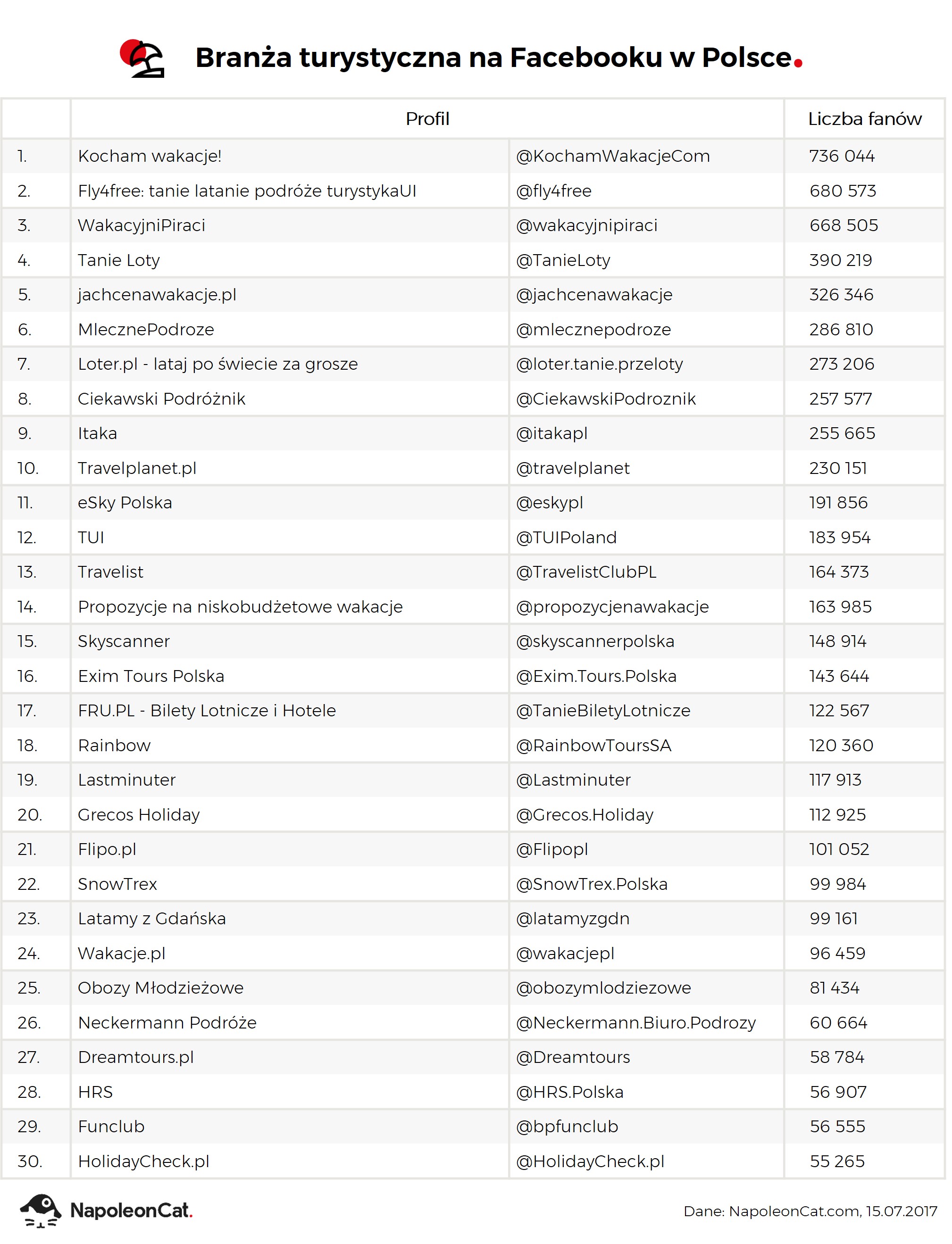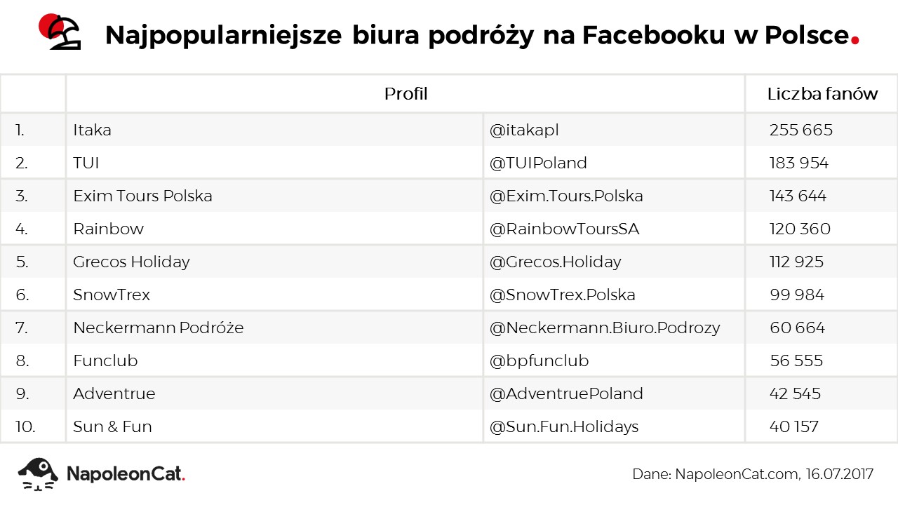 Firma NapoleonCat, udostępniająca narzędzie do zarządzania i analityki mediów społecznościowych, opracowała ranking najpopularniejszych stron związanych z branżą turystyczną. Zestawienie uwzględnia operatorów, agentów i pośredników turystycznych, jak również facebookowe strony serwisów rezerwacyjnych, wyszukiwarek ofert turystycznych, przelotów czy miejsc noclegowych itp. W rankingu nie zostały uwzględnione strony przewoźników, linii lotniczych, hoteli, blogów podróżniczych, ani też strony, na których można znaleźć opisy ciekawych miejsc do zwiedzenia, czy relacje z wypraw.