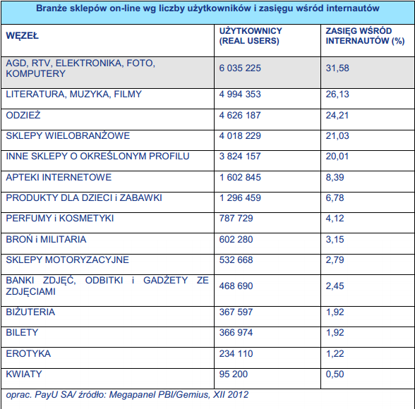 Według danych Magapanel PBI/Gemius, zasięg e-sklepów z segmentu RTV/AGD/Foto/Komputery osiągnął w 2012 r. poziom 31,6% – przy 6 mln użytkowników jest to najczęściej odwiedzana branża sklepów internetowych w Polsce.