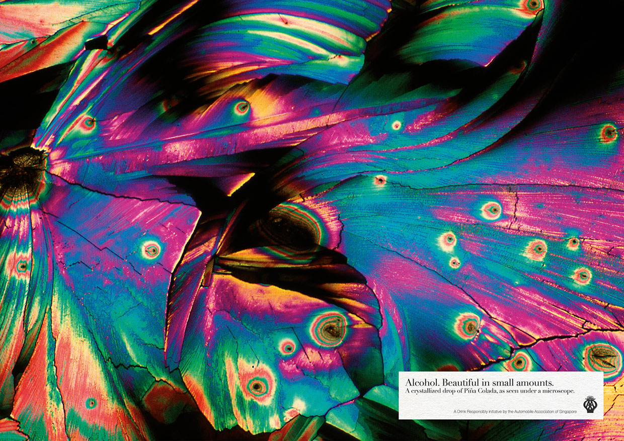 Seria printów pokazujących mikroskopowe zdjęcia różnych alkoholi. “Alkohol jest piękny w małych ilościach”. Zgoda! Pragnę jednak zauważyć, że widoczny gołym okiem kieliszek porto, na tle portugalskiego krajobrazu, też wygląda całkiem ładnie! A taka schłodzona butelka różowego wina, w którą wpadają ostatnie promienie zachodzącego słońca…