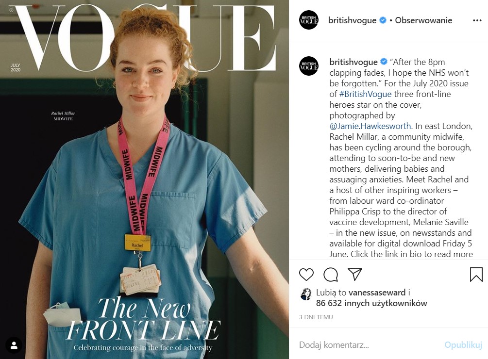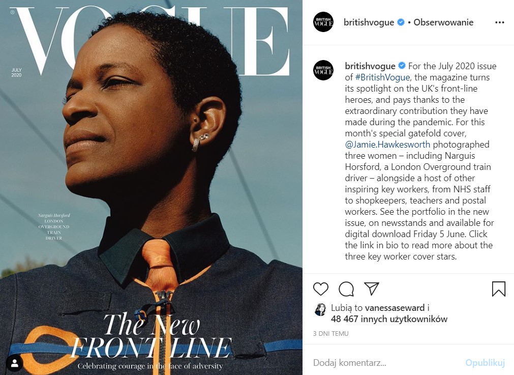 Teraz brytyjska edycja magazynu Vogue postanowiła zwrócić na to uwagę i oddała głos trzem kobietom, które w czasie pandemii codziennie narażały swoje życie, aby nasze społeczeństwo mogło w dalszym ciągu normalnie funkcjonować – mowa tu o położnej, kasjerce oraz maszynistce.