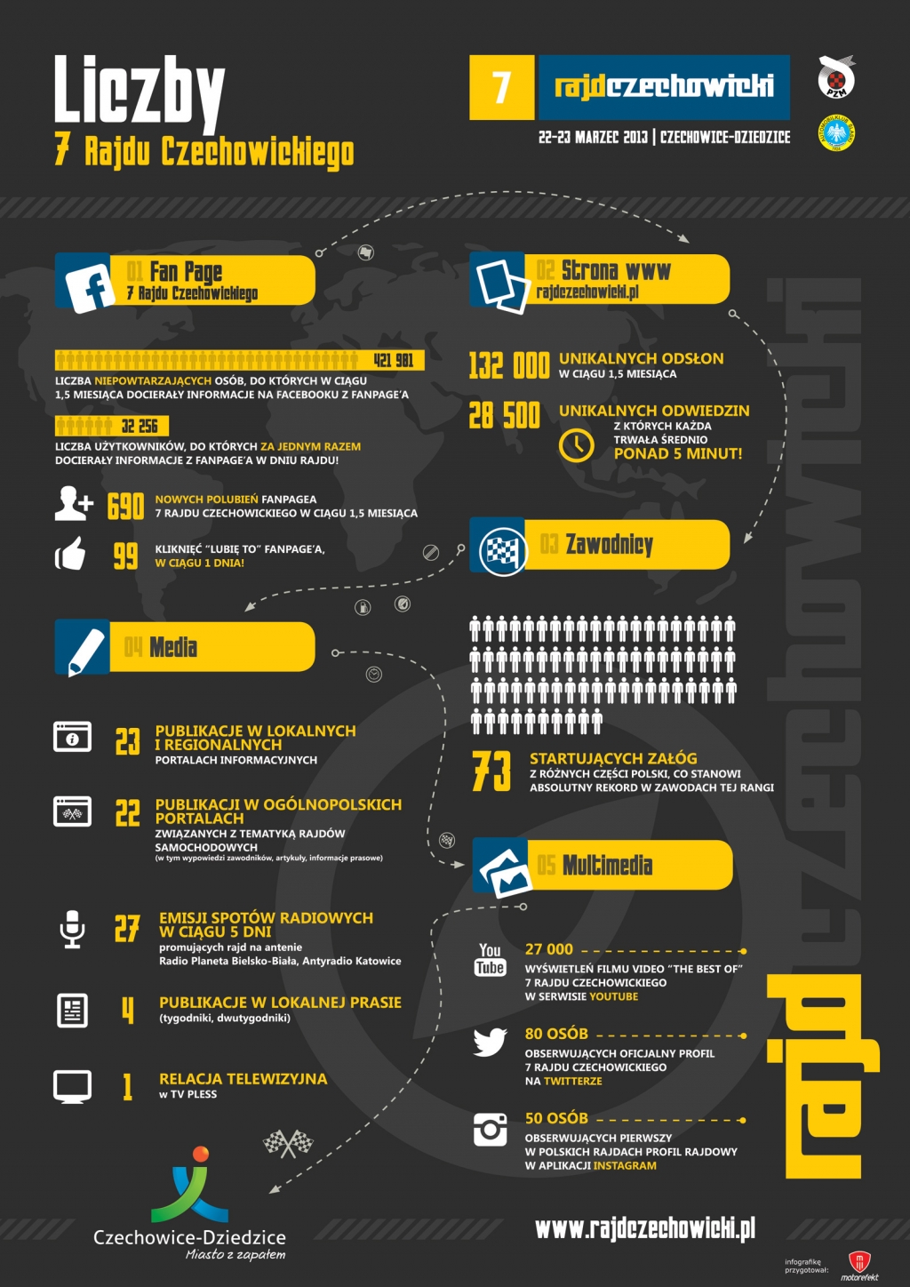 Facebook, jako kanał dotarcia do kibiców pobił inne instrumenty komunikacji wykorzystywane podczas 7 edycji Rajdu Czechowickiego. Dzięki niemu informacje najszybciej docierały do największej liczby odbiorców. Z infografiki widać słabnącą rolę standardowych mediów, natomiast strona internetowa wciąż dla sporej liczby osób stanowi ważne i inspirujące źródło informacji, co wskazuje m.in. średni czas spędzony na niej przez jednego użytkownika – ponad 5 minut!