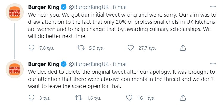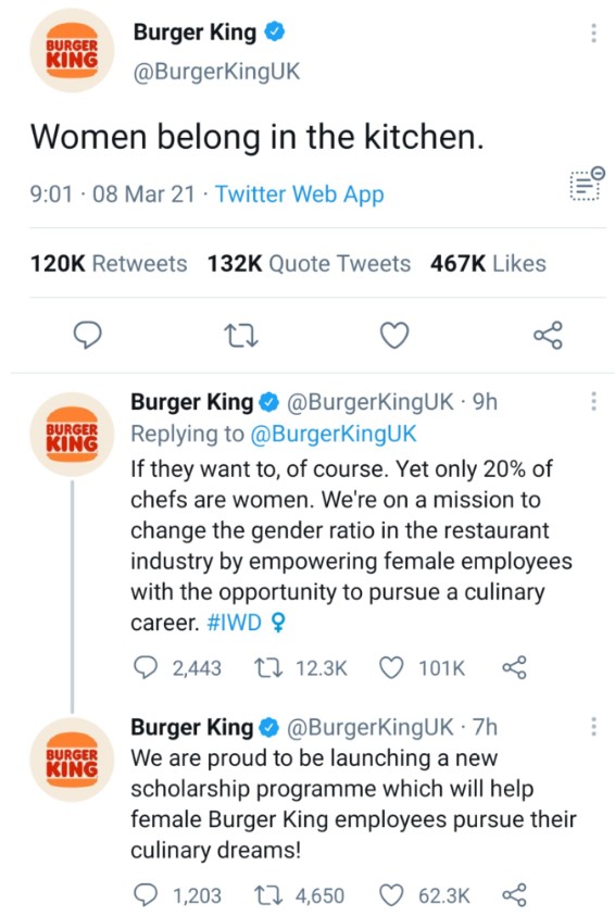 Z okazji tegorocznego Dnia Kobiet brytyjski oddział Burger Kinga opublikował na swoim twitterowym profilu serię tweetów. Jeden z nich brzmiał – „miejsce kobiet jest w kuchni”. W kontynuacji wpisu marka napisała, że „zaledwie 20% szefów kuchni to kobiety” i ogłosiła uruchomienie specjalnego programu, który ma za zadanie ułatwić przedstawicielkom płci żeńskiej karierę w branży kulinarnej.