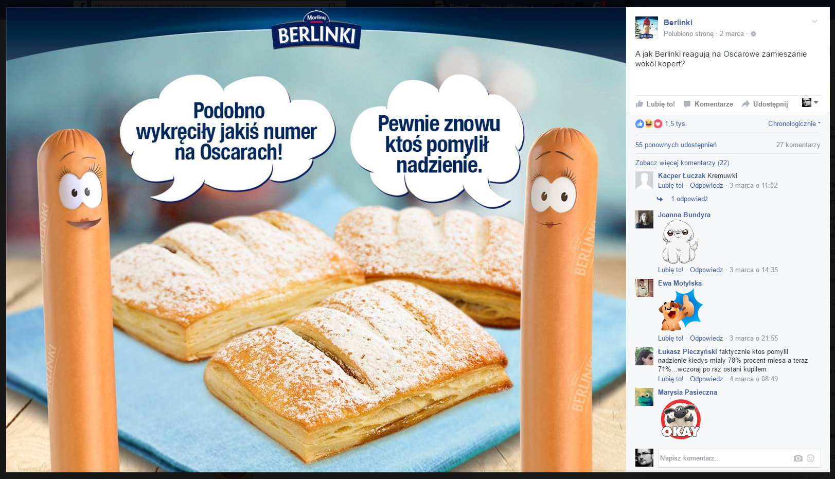 Content publikowany przez fanpage Berlinek to doskonały przykład tego, jak odniesienie się do aktualnych wydarzeń i podejście do tego z dystansem i humorem pozytywnie wpływa na wizerunek marki.