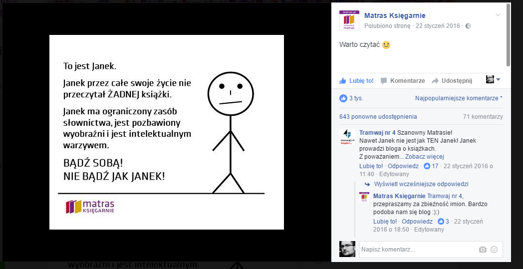 Był taki czas, że atakowały nas one ze wszystkich stron. I w tamtym momencie na fanpage’u księgarni Matras opublikowaliśmy coś takiego: