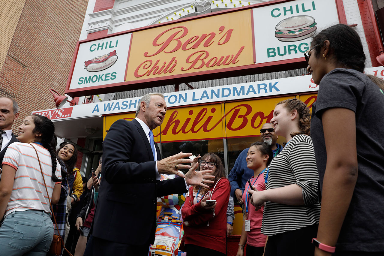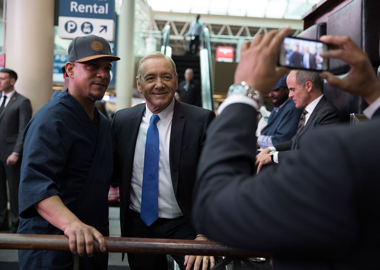 Na zdjęciach wykonanych przez fotografa, widzimy Kevina Spacey w najbardziej znanych miejscach Waszyngtonu oraz na ulicach miasta podczas spotkań z „wyborcami”.