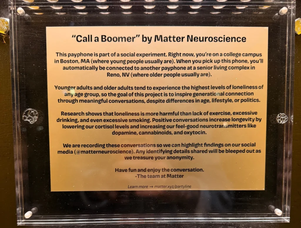 Organizacja badająca mechanizmy dobrostanu i zdrowia psychicznego Matter Neuroscience chce przypomnieć o tym, że najbardziej zwyczajna rozmowa może realnie wpłynąć na samopoczucie człowieka. Aby zachęcić do kontaktu z innymi, na terenie kampusu Uniwersytetu Bolońskiego umieszczono retro budkę telefoniczną. Wszystko to w ramach akcji „Call a Boomer”.