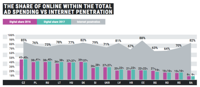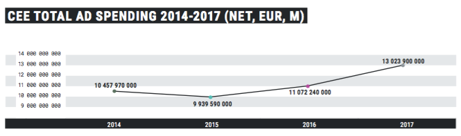Według najnowszej edycji raportu, reklamodawcy wydali o 2 mld euro więcej niż w roku poprzednim, a zatem wartość rynku reklamy w Europie Środkowej i Wschodniej osiągnęła w 2017 roku wartość 13 mld euro.