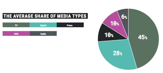 Wnioski te chyba najbardziej dobitnie potwierdza fakt, iż w większości krajów w regionie, z wyjątkiem Czech, Węgier i Litwy, telewizja jest nadal tym typem mediów, który pochłania większą część wszystkich wydatków reklamowych. Ponadto, regionalna średnia udziału poszczególnych typów mediów wskazuje, iż telewizja nadal stanowi 45% całości rynku reklamowego w Europie Środkowej i Wschodniej, podczas gdy raptem jedna trzecia tych wydatków przeznaczana jest na reklamę w Internecie.