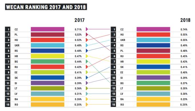 Aby przedstawić bardziej wnikliwy obraz branży reklamowej, twórcy raportu stworzyli tzw. WeCAN Ranking. Porównuje on wyniki 15 rynków reklamowych w Europie Środkowej i Wschodniej poprzez zestawienie udziału wydatków reklamowych per capita w nominalnym PKB per capita danego kraju.