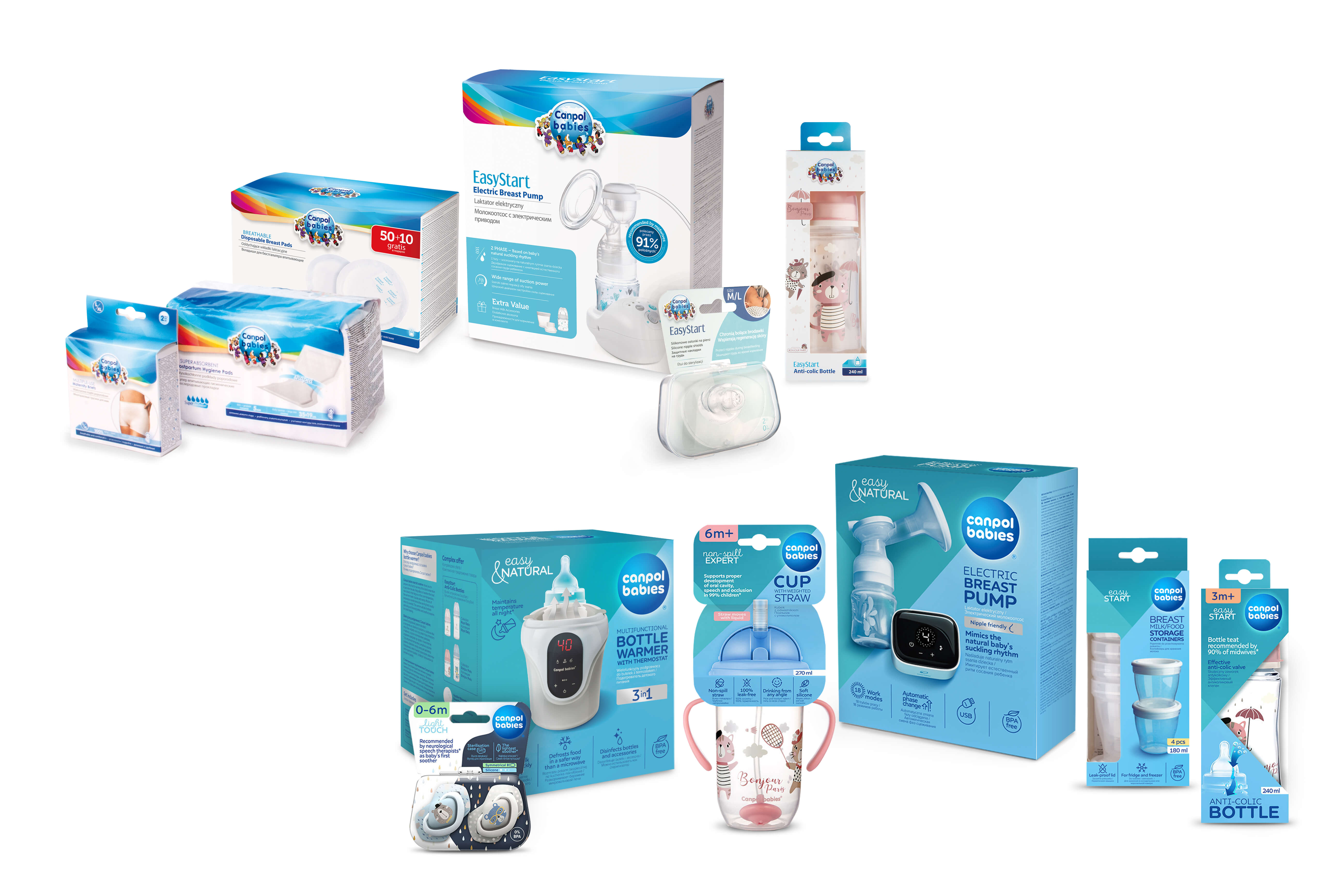 Oprócz logotypu zmianie wizualnej uległy również opakowania. Dzięki nowemu wzornictwu produkty będą odznaczały się na półce sklepowej czy na listingach produktowych w sklepach online i przyciągały wzrok konsumenta. Cała kreacja jest spójna, jednolita kolorystycznie i nowoczesna. Co ważne dla konsumenta – na opakowaniach pojawią się czytelne i wyraziste USP (Unique Selling Proposition) produktu. Kluczowe cechy produktów przedstawione zostaną w czytelny sposób w formie ikon. Mamy sięgając po produkt Canpol babies od razu zobaczą wyraźną indykację wiekową. Co więcej – pojawią się także prezentacje produktów, dzięki czemu będzie można zapoznać się z nim, jeszcze przed wyciągnięciem z opakowania.