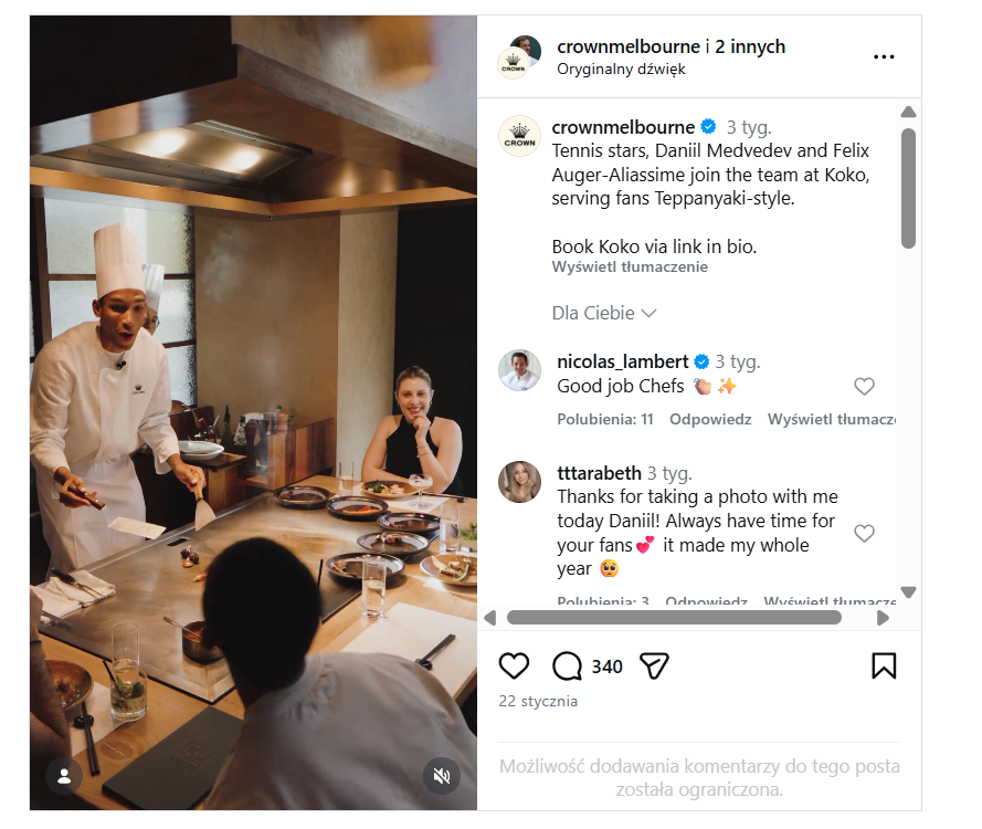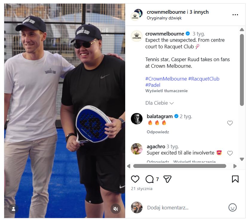 – Te zaskakujące chwile służą tworzeniu niezapomnianych wrażeń dla gości – interakcji, o których goście będą rozmawiać długo po wyjściu. Widok światowej klasy tenisistów pomagających gościom z bagażami i przyrządzających teppanyaki przypomina nam, że w Crown zabawa może się zdarzyć wszędzie, w każdej chwili – komentuje Ed Domingo, dyrektor generalny Crown Melbourne.