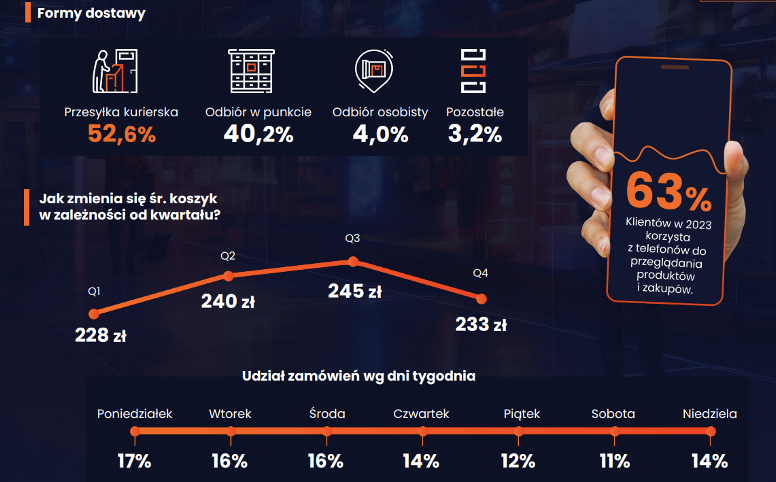Od kilku lat coraz chętniej robimy zakupy przez urządzenia mobilne. W 2023 r. ich udział w zakupach stanowił 63%. Co ciekawe, znaczenie ma również czas, kiedy robimy zakupy. Najwięcej zamówień jest dokonywanych na początku tygodnia.