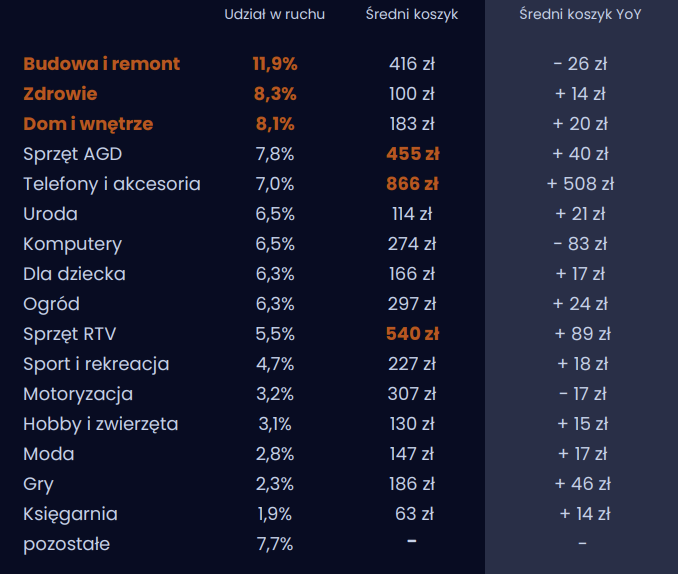 Podobnie jak w ubiegłym roku, w zakupach online królują branże Budowa i remont, Zdrowie oraz Dom i wnętrze, które łącznie generują ponad 28% wszystkich odsłon. Największy wzrost zainteresowania widoczny jest w branży Telefony i akcesoria (+2,5 p.p.), Komputery (+1,2 p.p) oraz Ogród (+0,9 p.p).