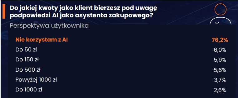 Ceneo zapytało kupujących, czy korzystają ze wsparcia AI podczas zakupów online. 76,2% kupujących jeszcze nie korzysta z tego rozwiązania w swoich decyzjach zakupowych. Natomiast 6% bierze pod uwagę podpowiedzi sztucznej inteligencji w zakupach do 50 zł.
